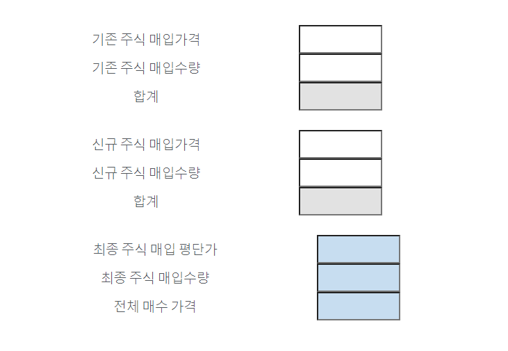 저는 예시로 기존 주식 매입가격을 5만원으로 5주 매입했다고 입력했는데요. 신규 주식은 3만원에 5주 매수한다고 입력해 보겠습니다.