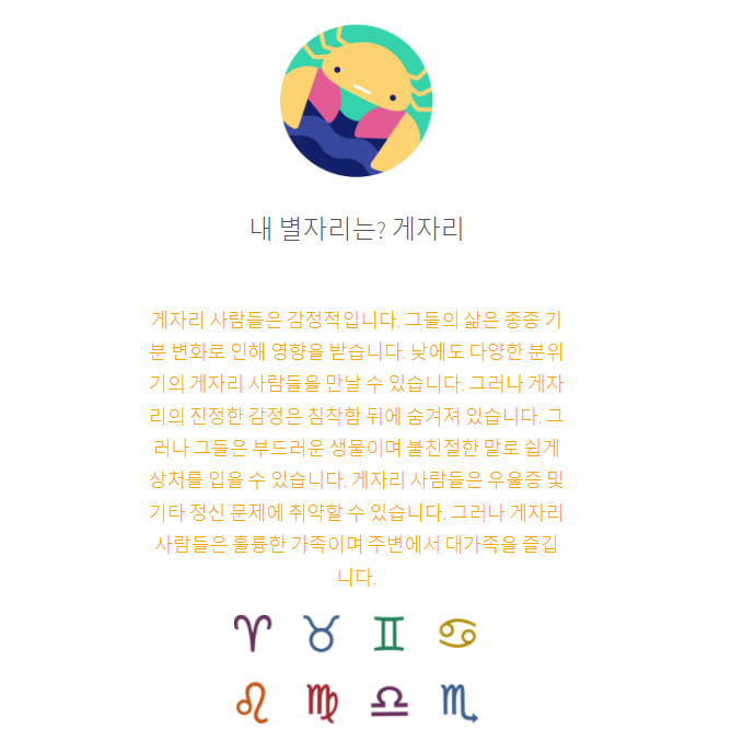 게자리의 경우 감정적인 성격을 가지고 있다고 하며, 삶이 기분에 따라 많이 영향을 받는다고 하네요. 이와 같이 내 생일을 입력하면 내 별자리가 무엇인지도 알 수 있으며 해당 별자리를 가진 사람들의 성격도 알 수 있으니 해당 사이트를 이용해서 별자리와 성격을 알아보시길 바랍니다.
